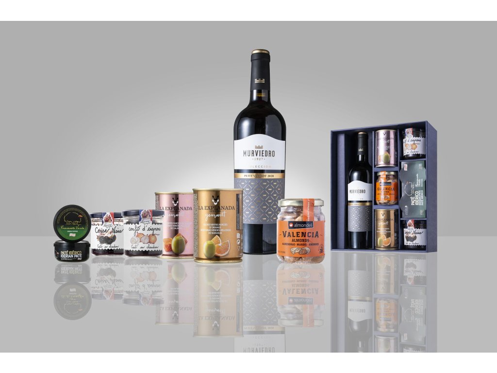 sada-víno M Petit Verdot C+mandle+2xolivy E280g+2xchutney LG+paštika